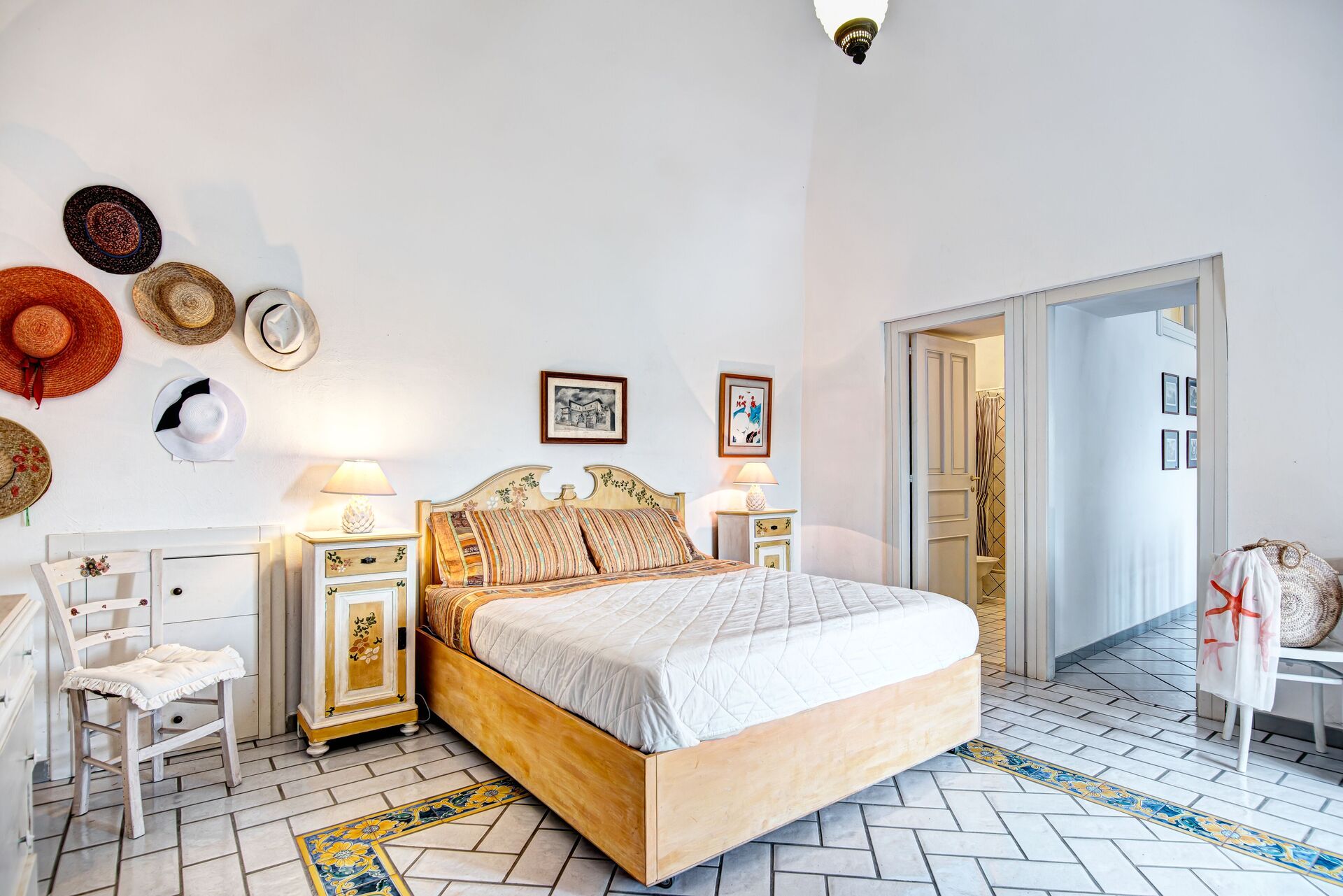 La scala dal salone conduce alla zona notte della Villa principale, con camera da letto padronale e due camere doppie, tutte con bagno privato. La grande camera da letto padronale è arredata in modo caratteristico con finiture mediterranee in legno e decorazioni floreali, questa camera dispone di un letto matrimoniale queen-size, scrivania e angolo lettura, cabina armadio e bagno privato con doccia sulla vasca, lavabo, bidet e WC. Tra le camere da letto c'è un piccolo atrio che si apre su una terrazza panoramica con vista mozzafiato sulla costa sorrentina con il maestoso Vesuvio come fondale. Una delle camere da letto si apre su questa terrazza.