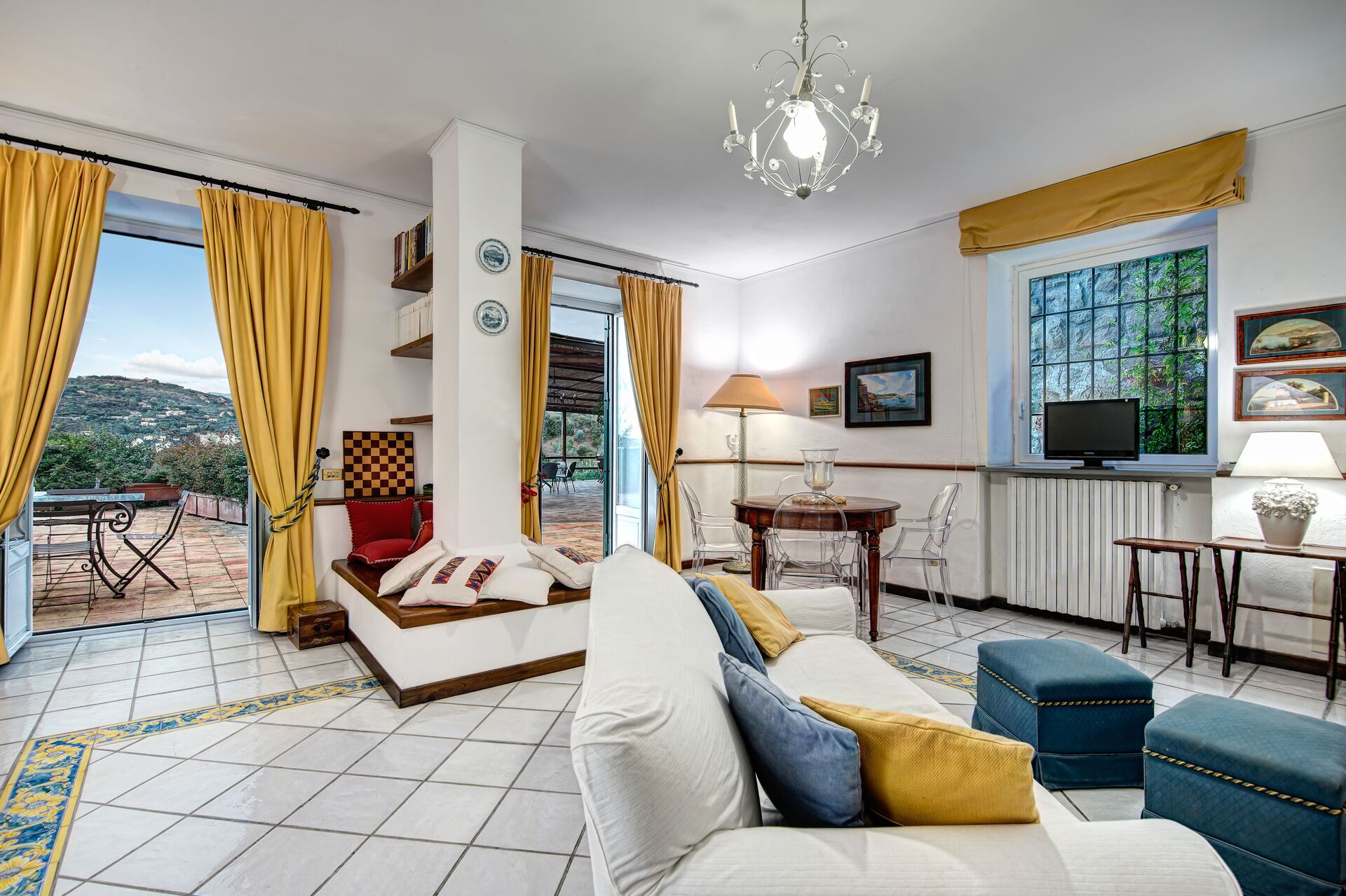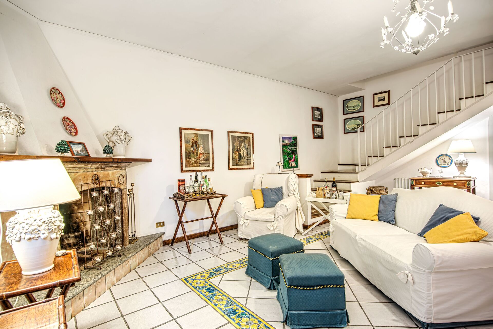 Dalla cucina, salendo due scale, si accede al salotto formale della Villa dotato di due comodi divani a tre posti che offrono un caldo e accogliente rifugio per i mesi più freddi.