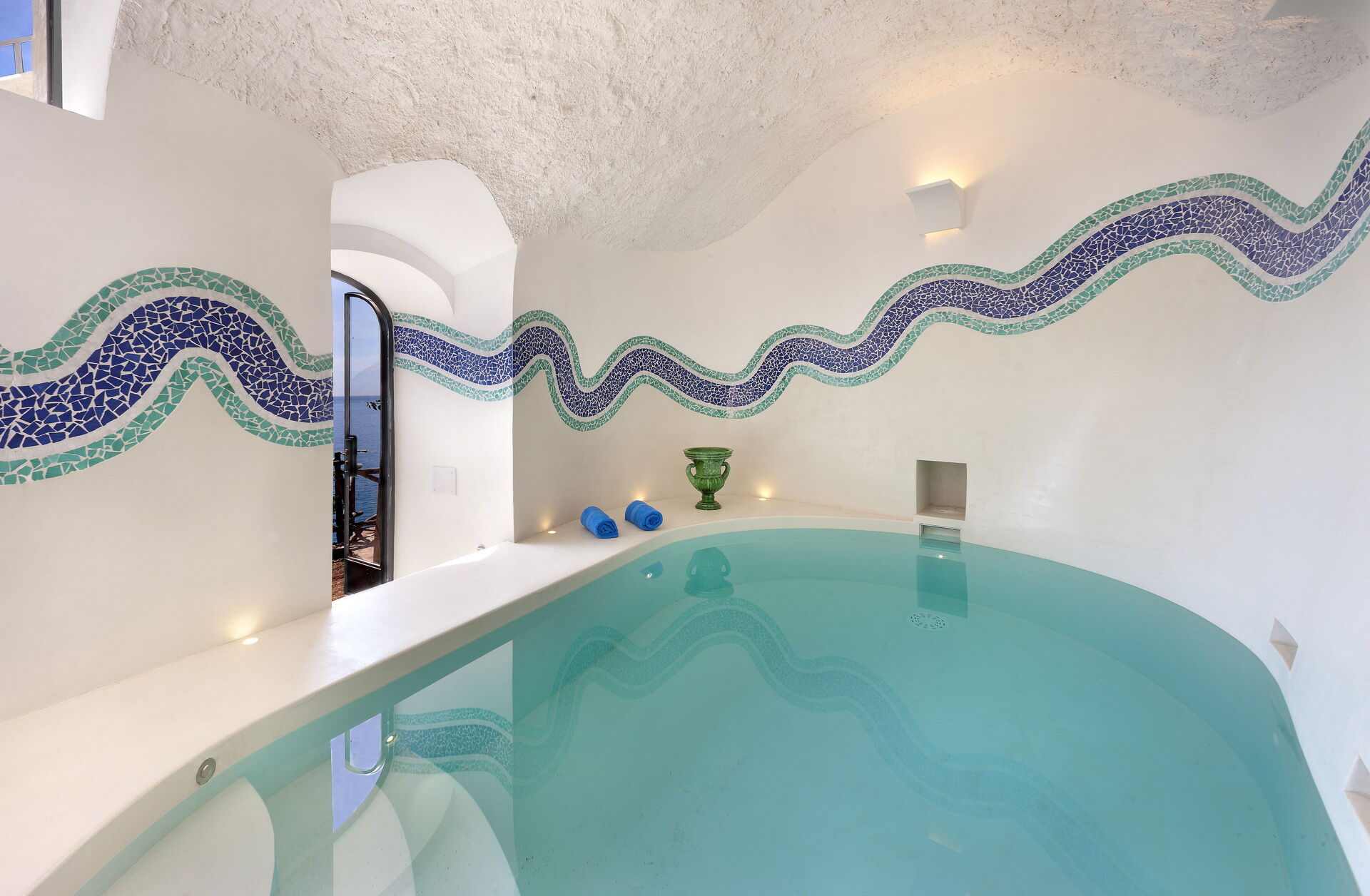Di pertinenza della villa un terrazzo esterno privato e arredato con tavolo e sedie per mangiare all'aperto con vista panoramica sul mare. Il punto forte di questa villa è la piscina privata interna da dove si scorge il mare, per un'esperienza di relax unica. Di pertinenza un piccolo spazio con lettini prendisole.