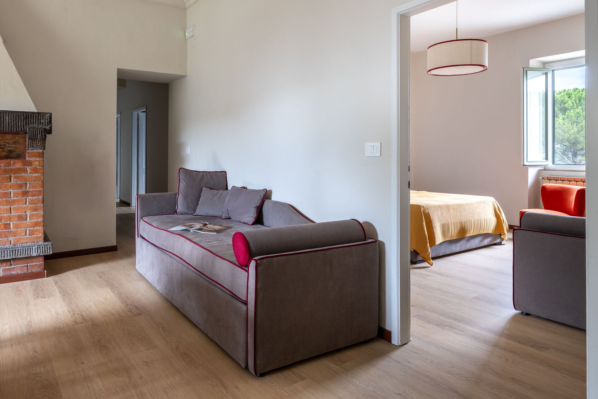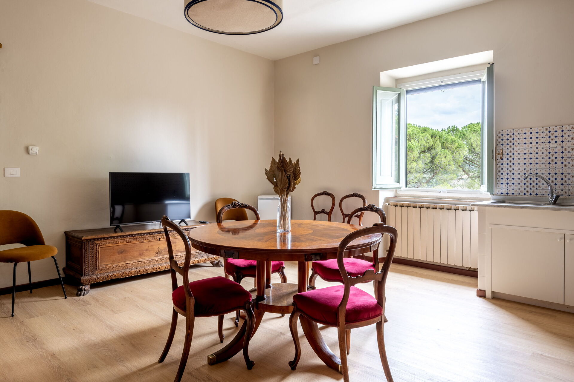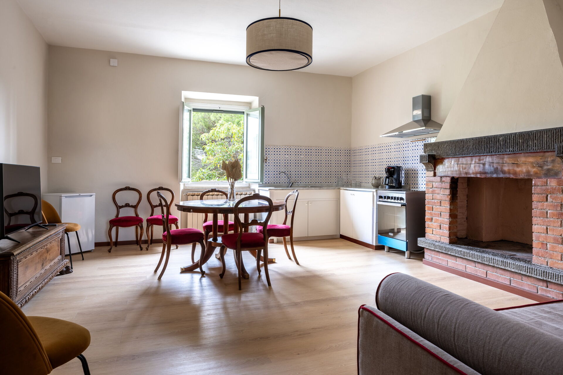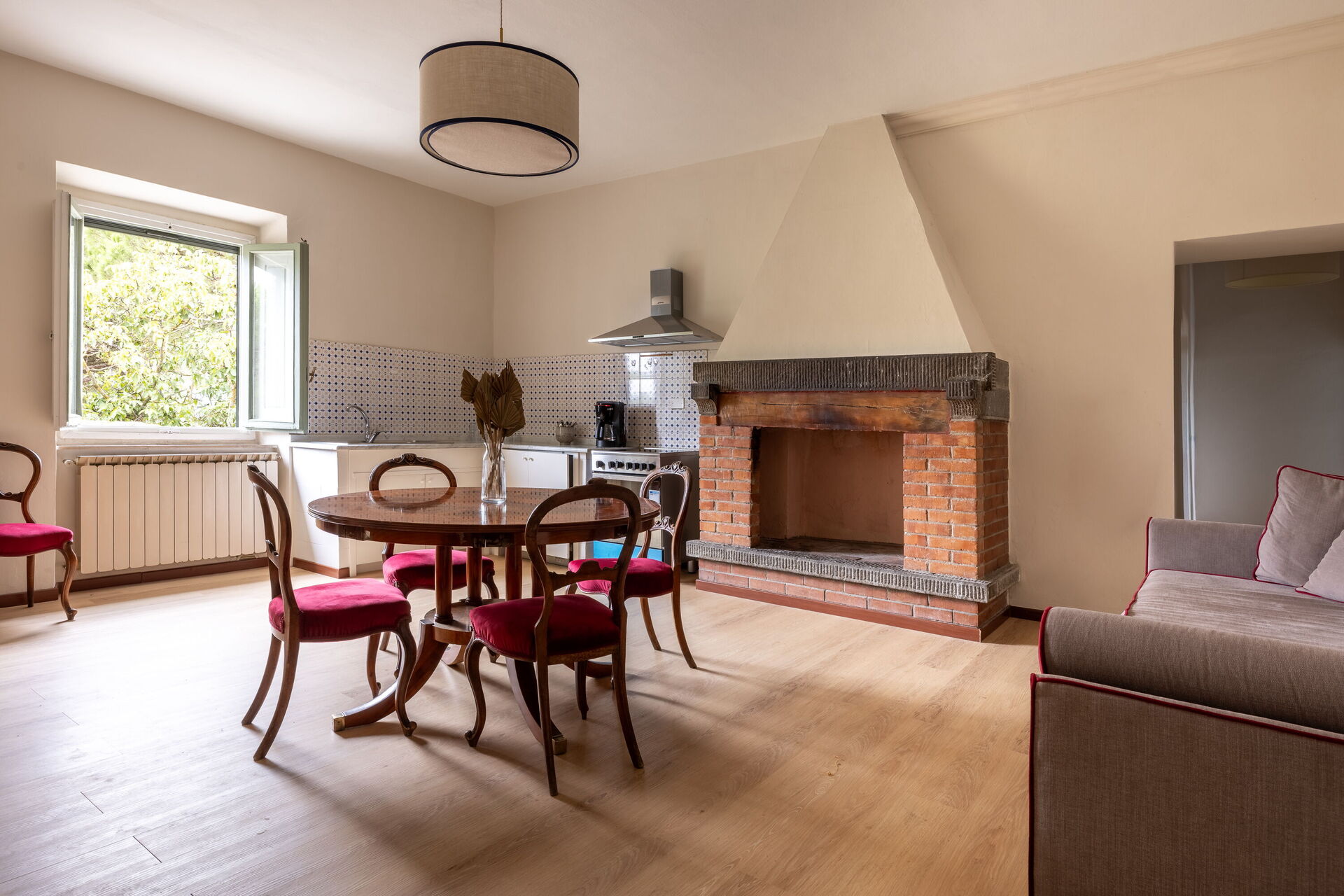 Situato al primo piano, questo accogliente appartamento offre ambienti funzionali e ideali per una vacanza nel Chianti. L’ampio soggiorno è arredato con un divano, una TV a schermo piatto, e un pratico tavolo da pranzo per gustare i pasti in compagnia. L’angolo cottura è con piano cottura a induzione. La zona notte è composta da due spaziose camere matrimoniali, bagno privato con doccia e televisione.