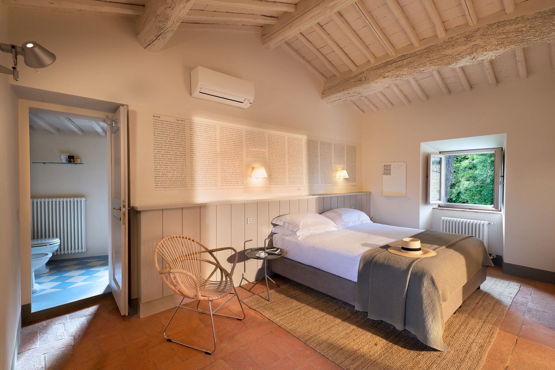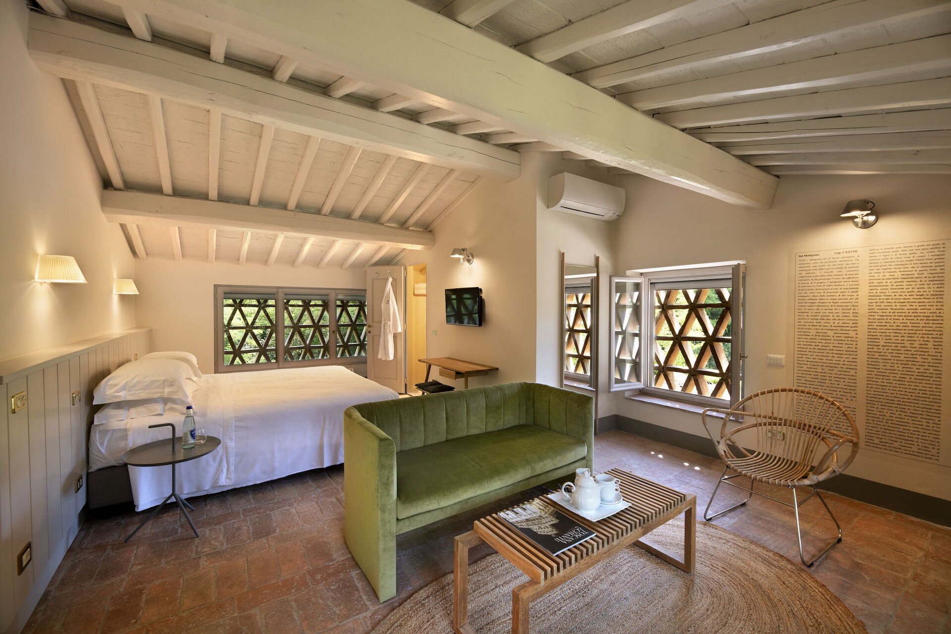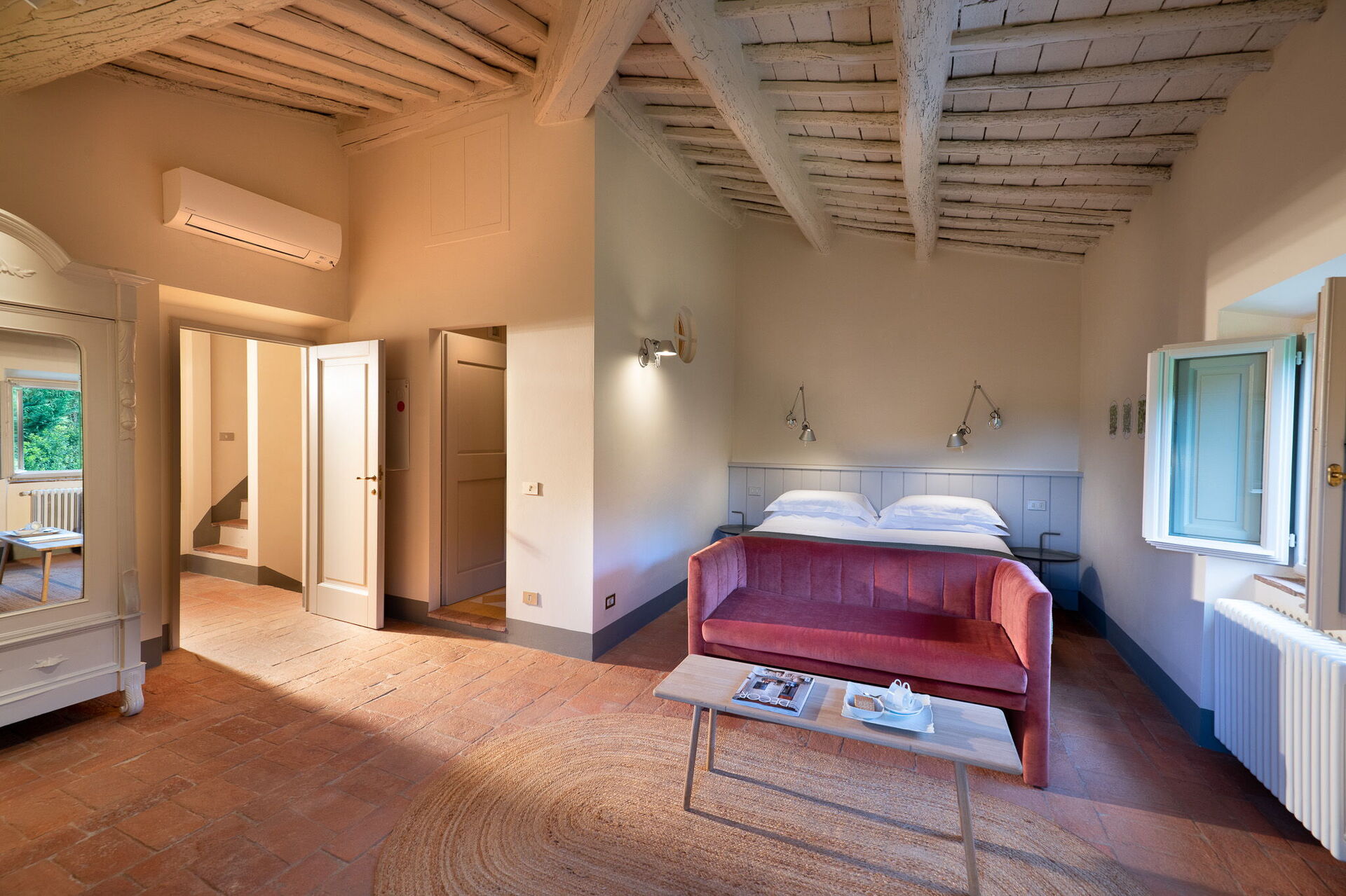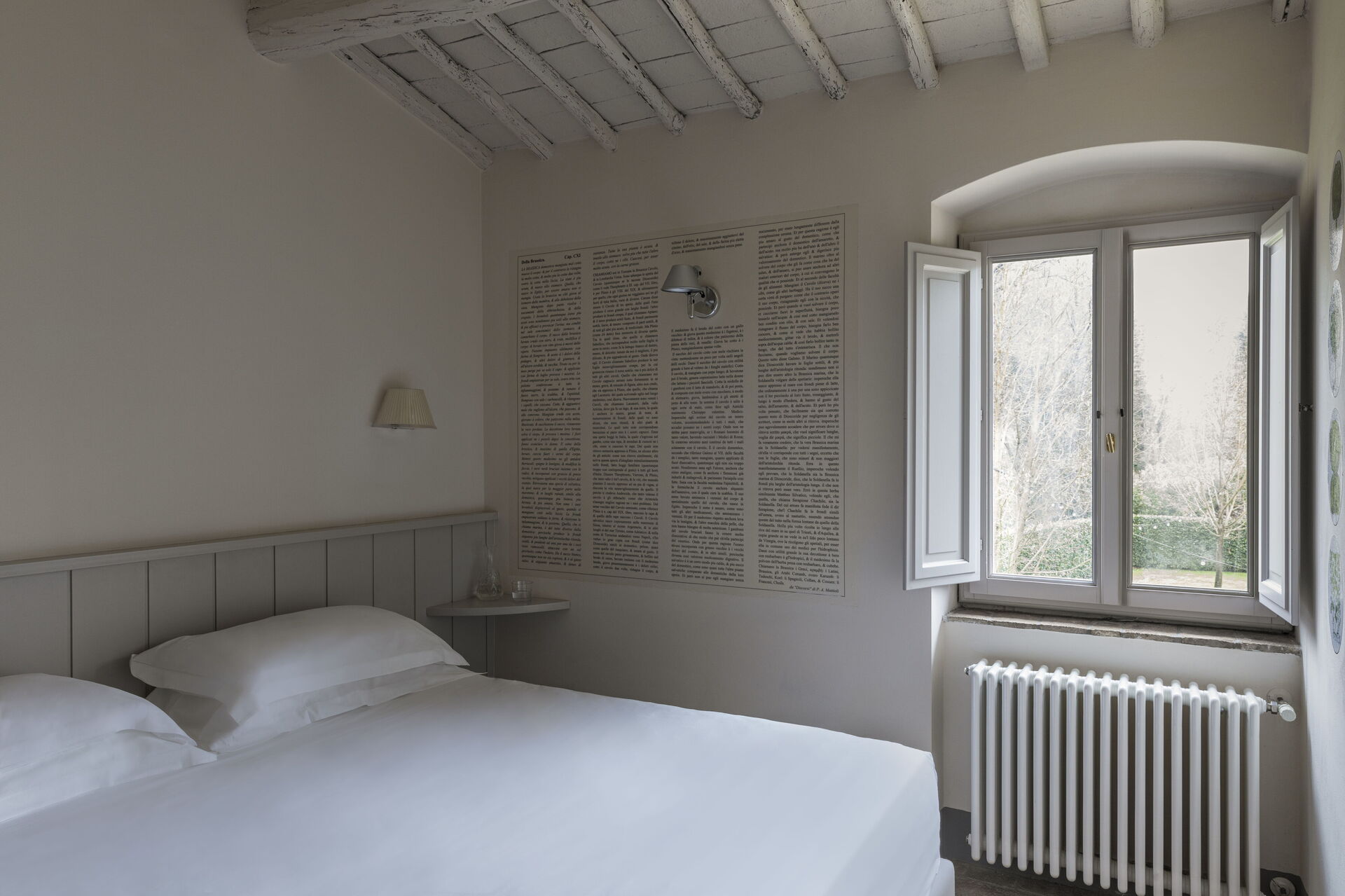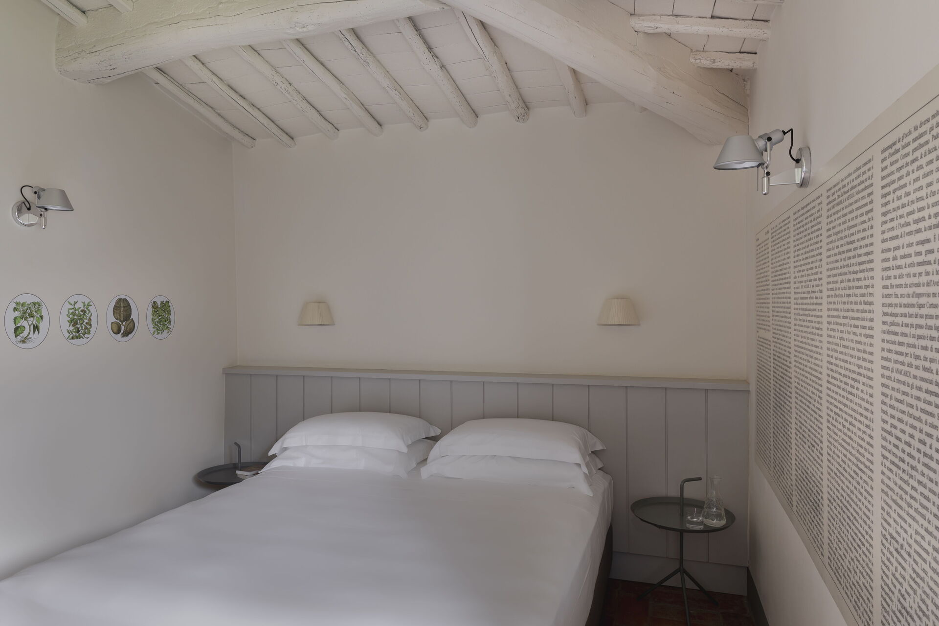 Il casale è suddiviso in 4 appartamenti con ingressi separati. Gli alloggi si distinguono per uno stile fresco e contemporaneo, con ambienti luminosi e arredi di design italiano che uniscono comfort e raffinatezza. Ogni camera è arricchita da eleganti grafiche ispirate alle illustrazioni botaniche del naturalista cinquecentesco Gherardo Cibo, creando un dialogo armonioso tra arte, natura e ospitalità.
