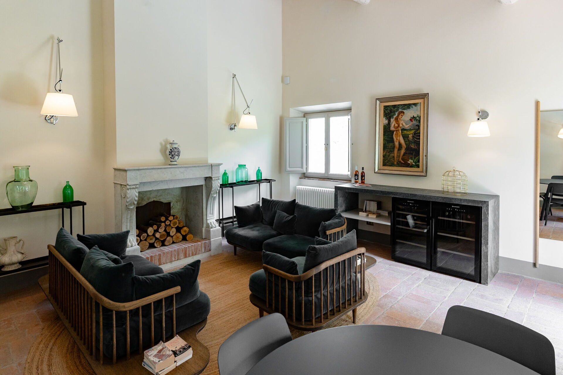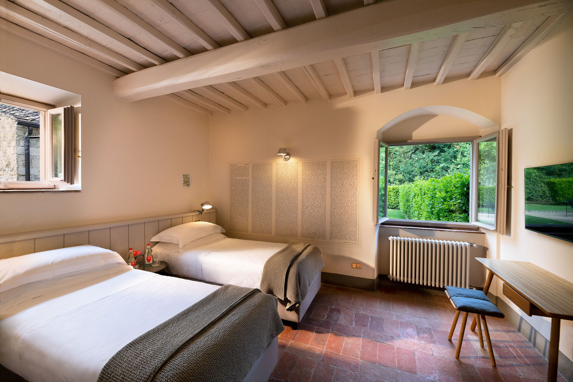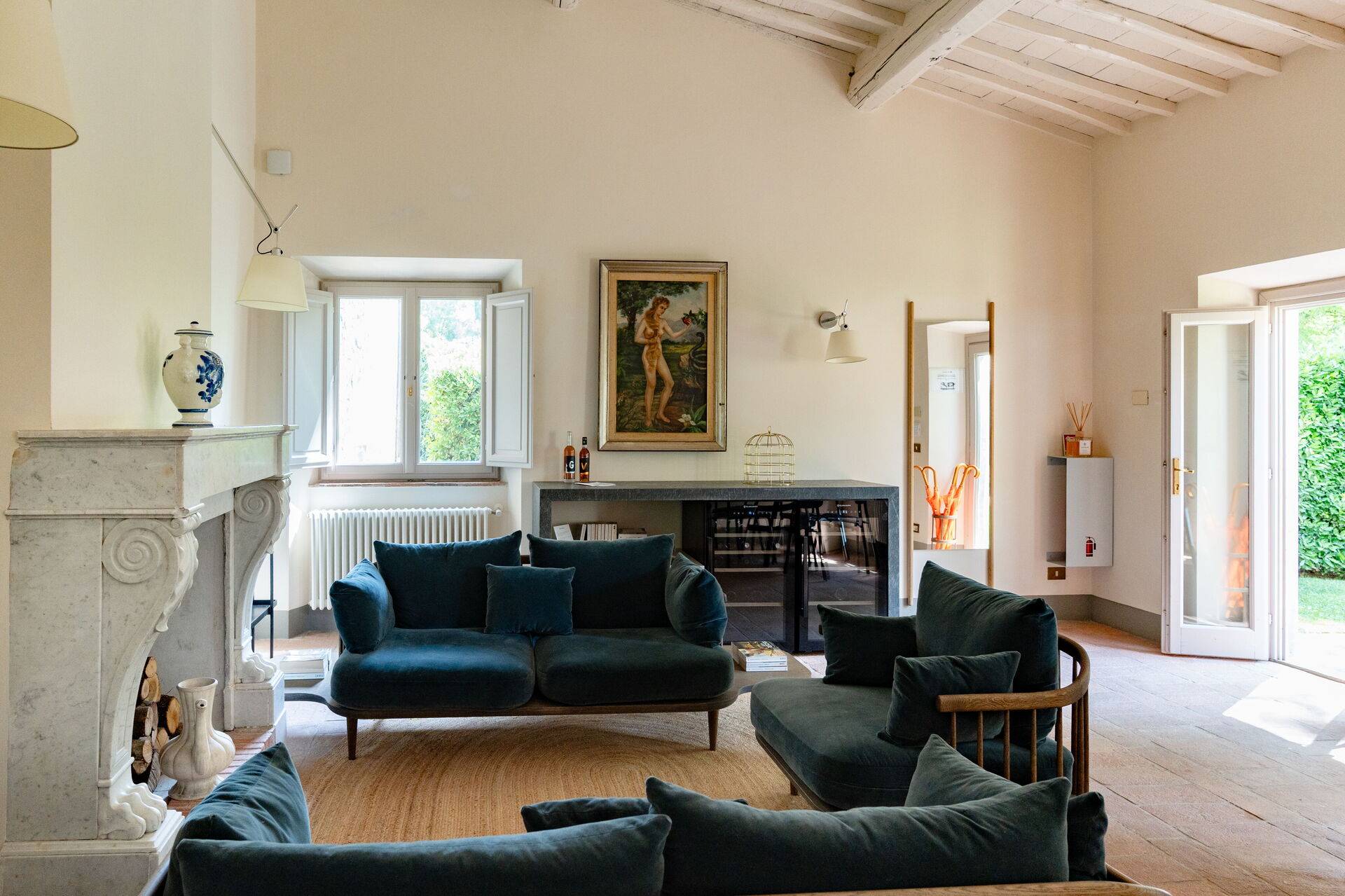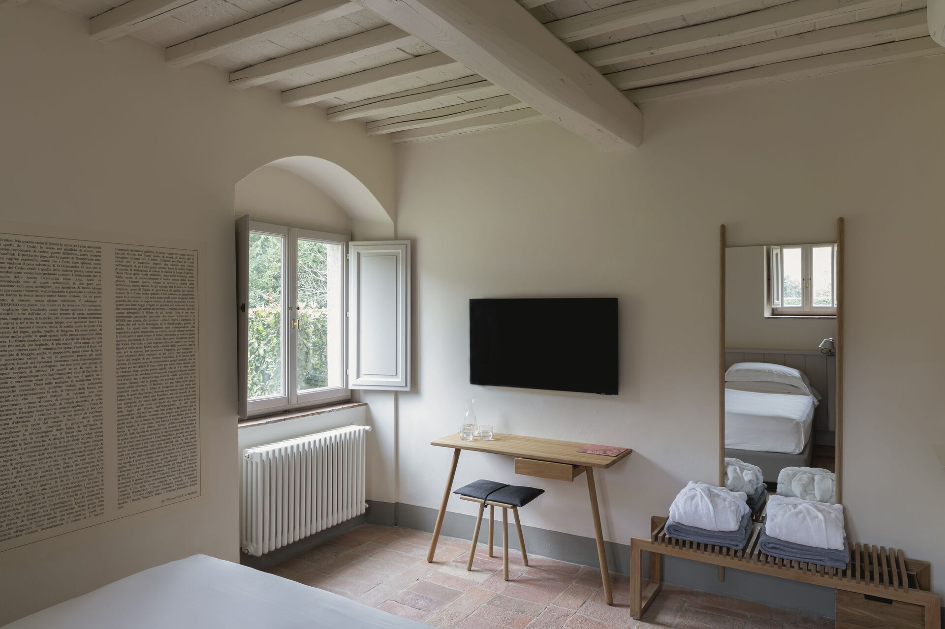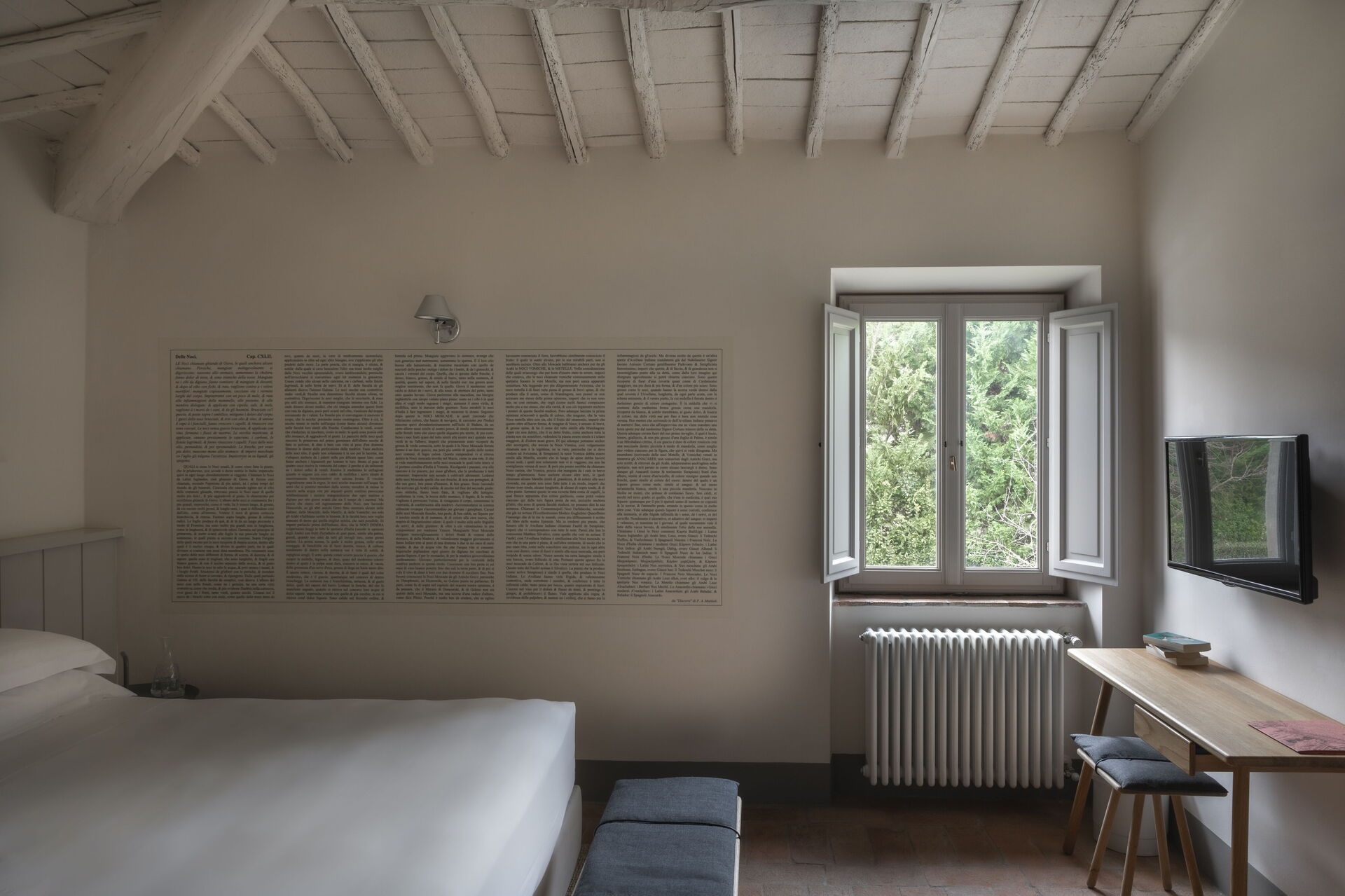 Il casale è suddiviso in 4 appartamenti con ingressi separati. Gli alloggi si distinguono per uno stile fresco e contemporaneo, con ambienti luminosi e arredi di design italiano che uniscono comfort e raffinatezza. Ogni camera è arricchita da eleganti grafiche ispirate alle illustrazioni botaniche del naturalista cinquecentesco Gherardo Cibo, creando un dialogo armonioso tra arte, natura e ospitalità.