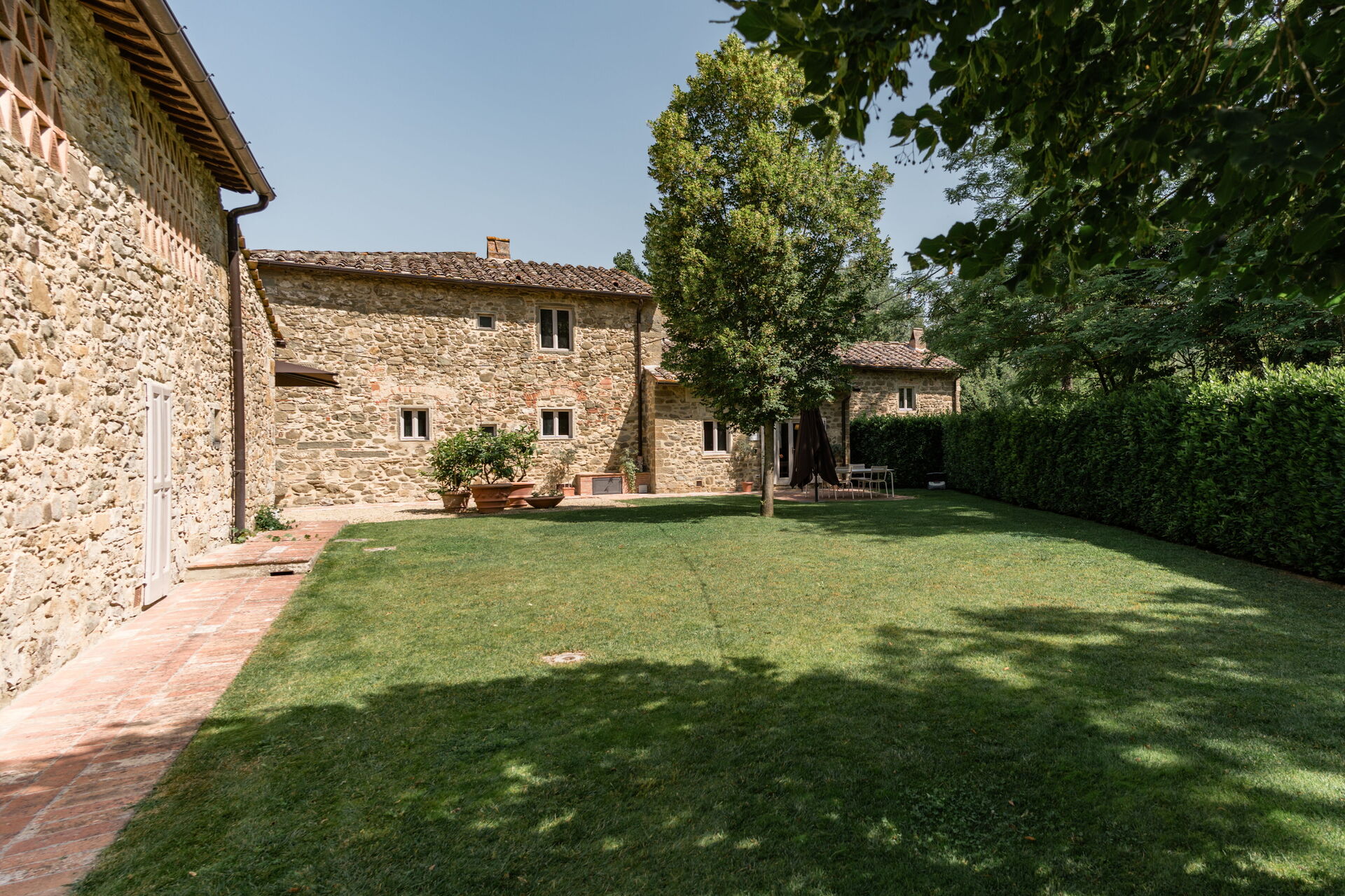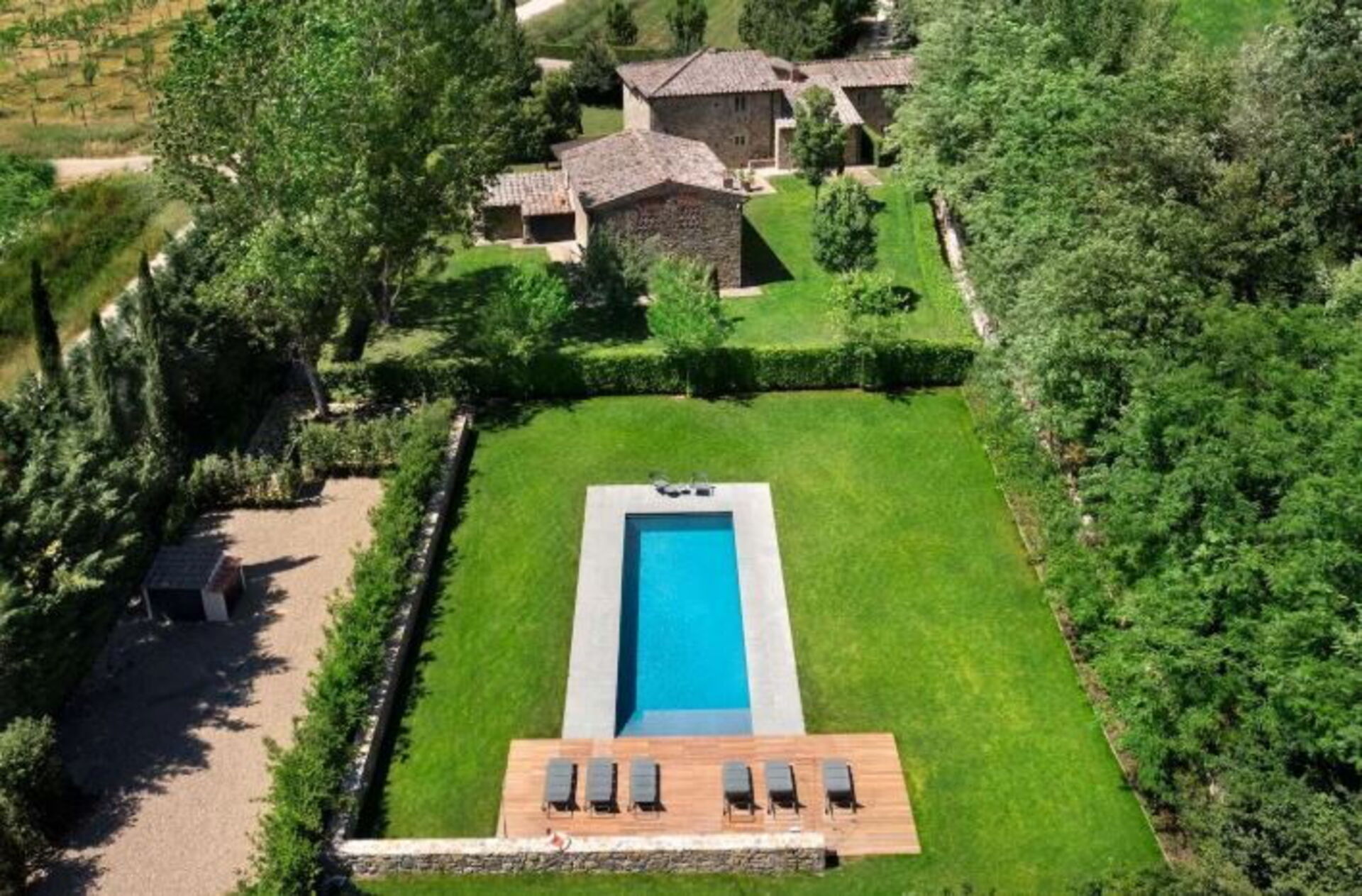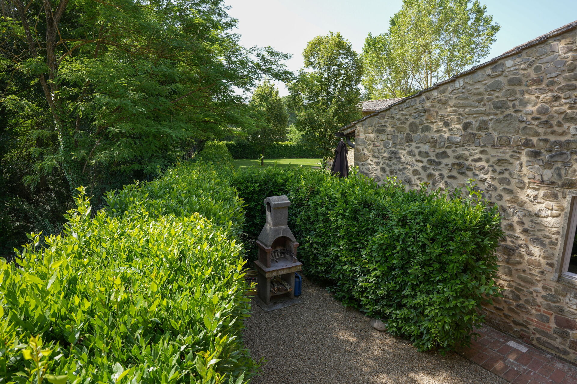 Il giardino è circondato da meli e pioppi, alti alberi di alloro, lecci e tigli. Un bellissimo prato verde circonda i casali in pietra e conduce alla piscina, circondata da un solarium dove è possibile rilassarsi completamente e godersi il sole.