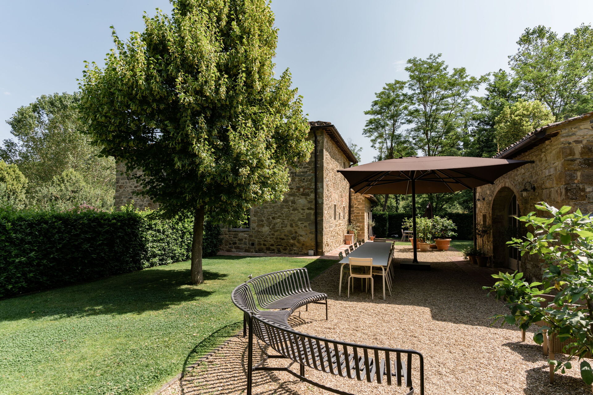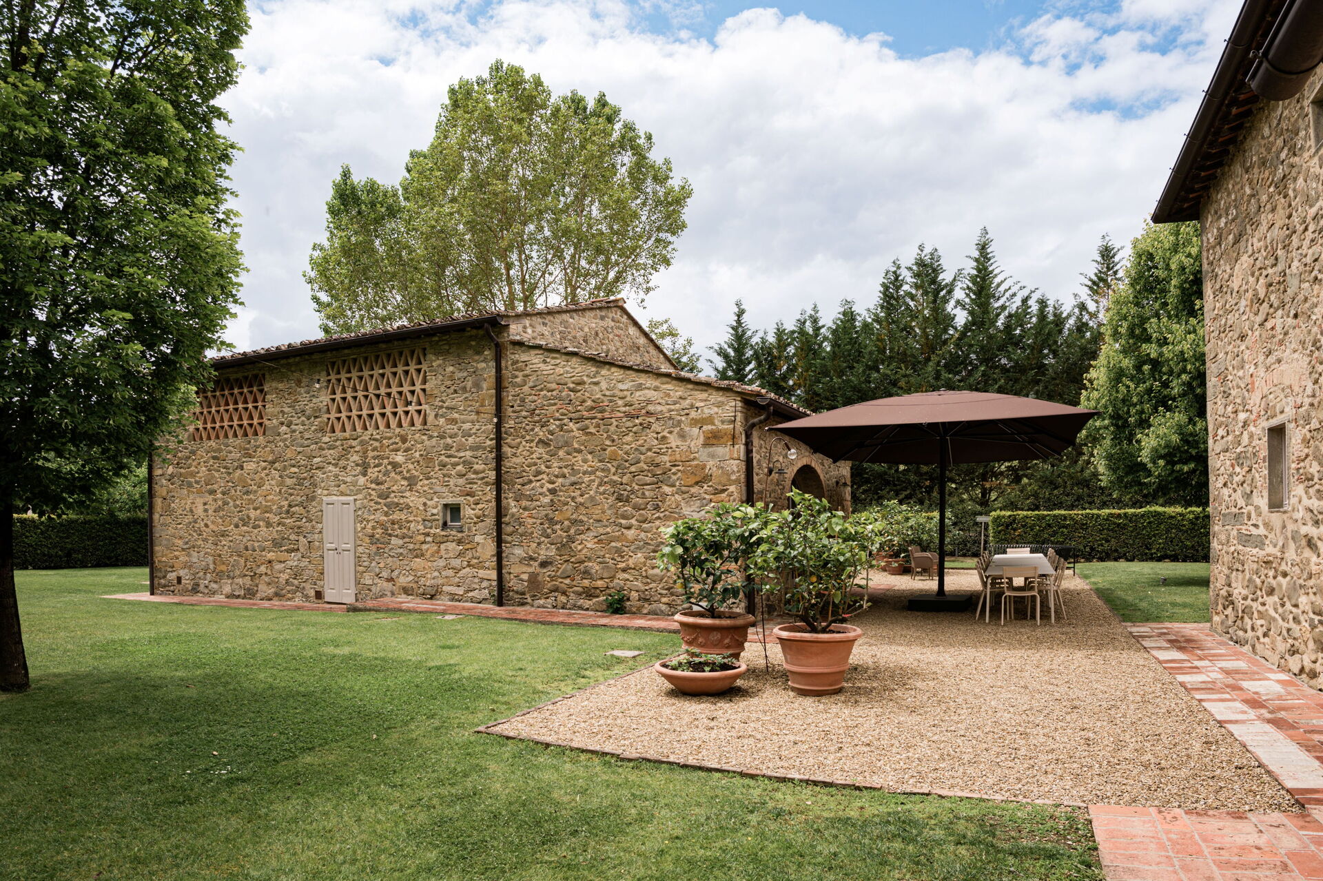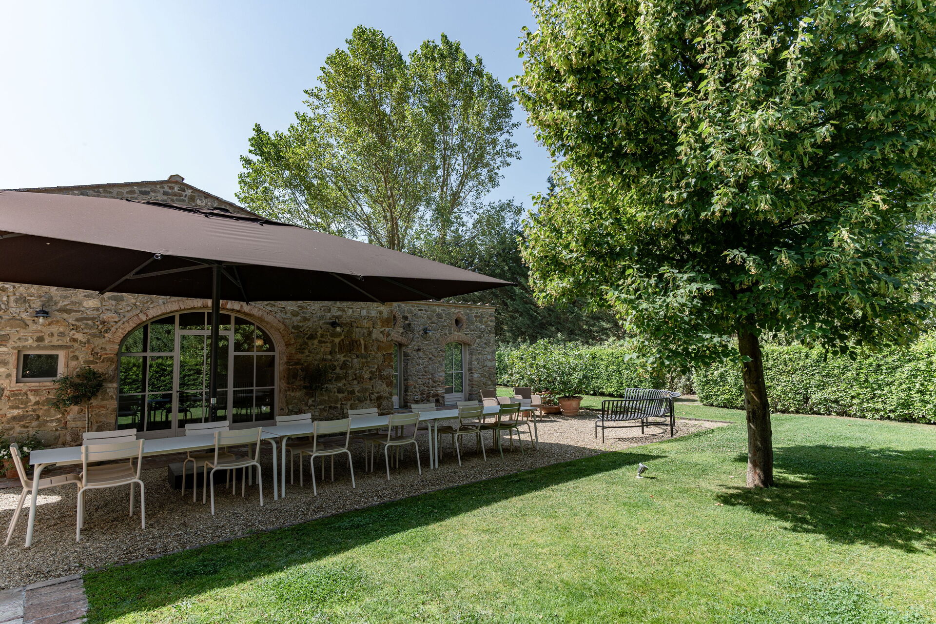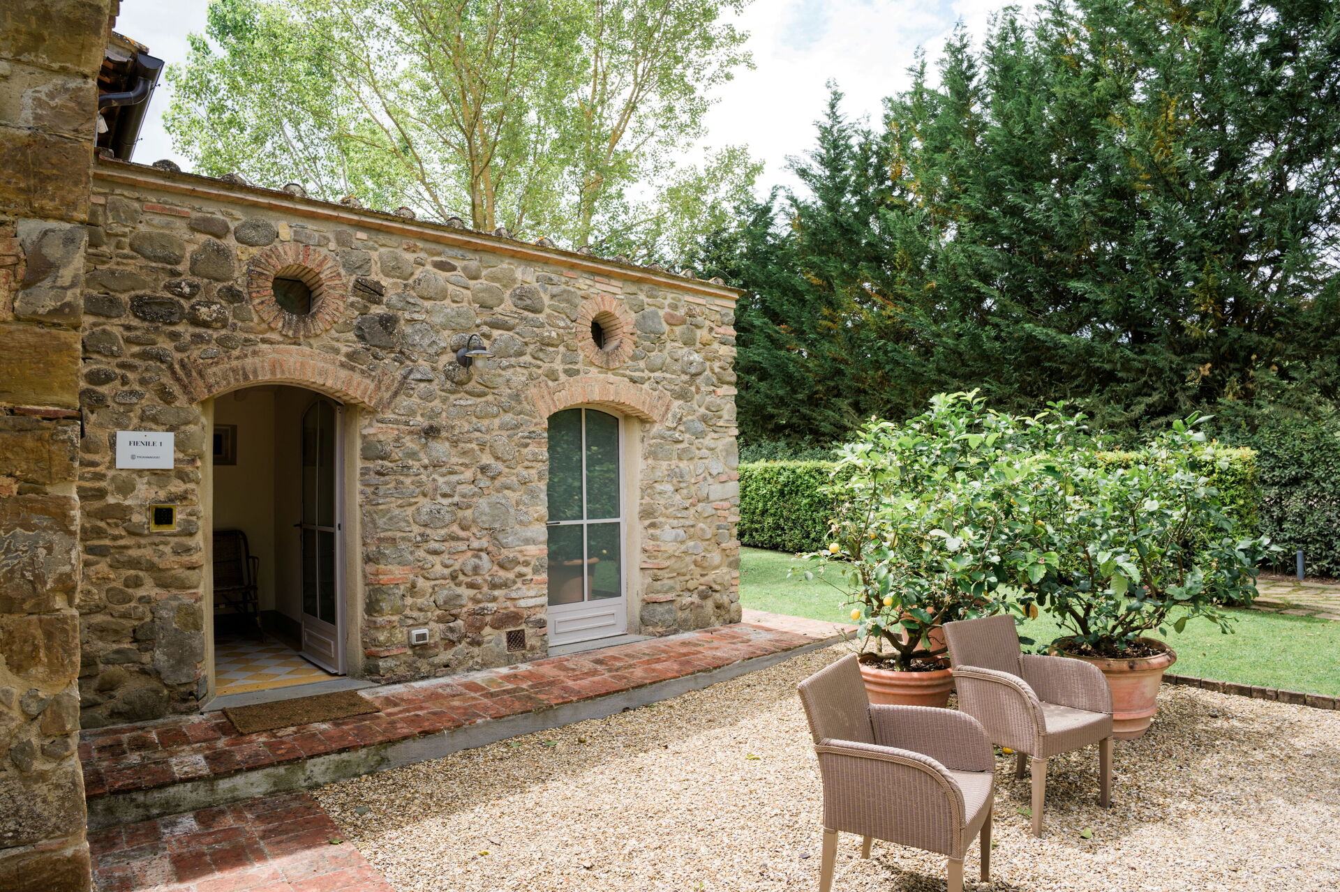 Il giardino è circondato da meli e pioppi, alti alberi di alloro, lecci e tigli. Un bellissimo prato verde circonda i casali in pietra e conduce alla piscina, circondata da un solarium dove è possibile rilassarsi completamente e godersi il sole.