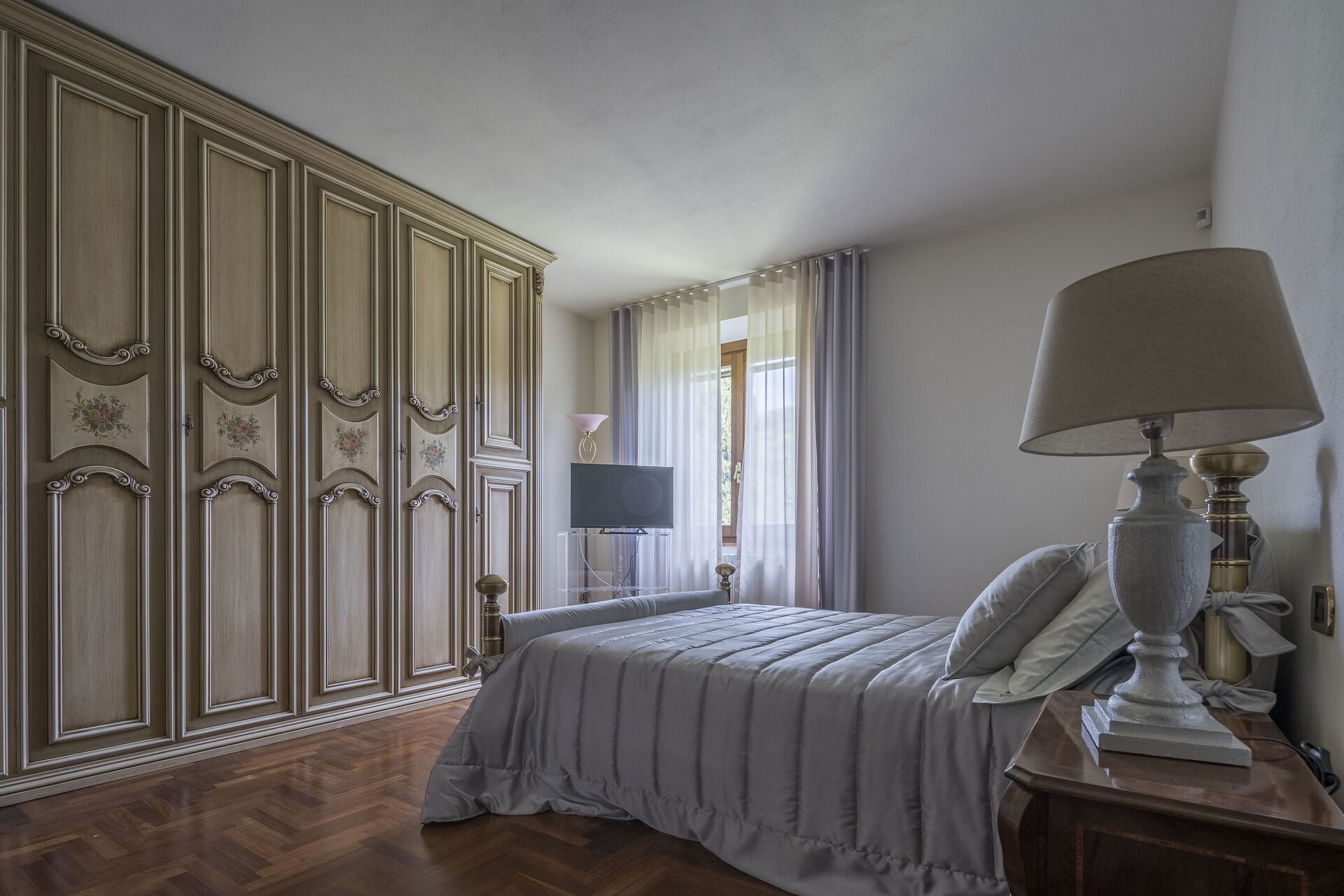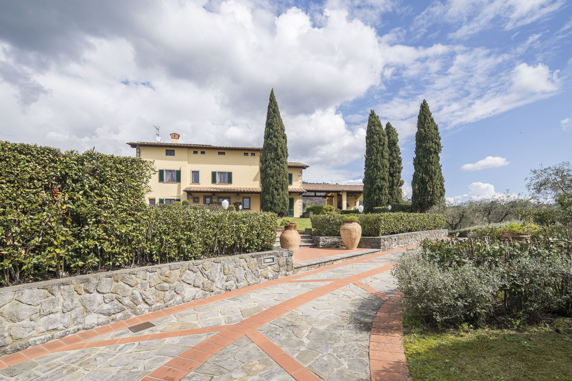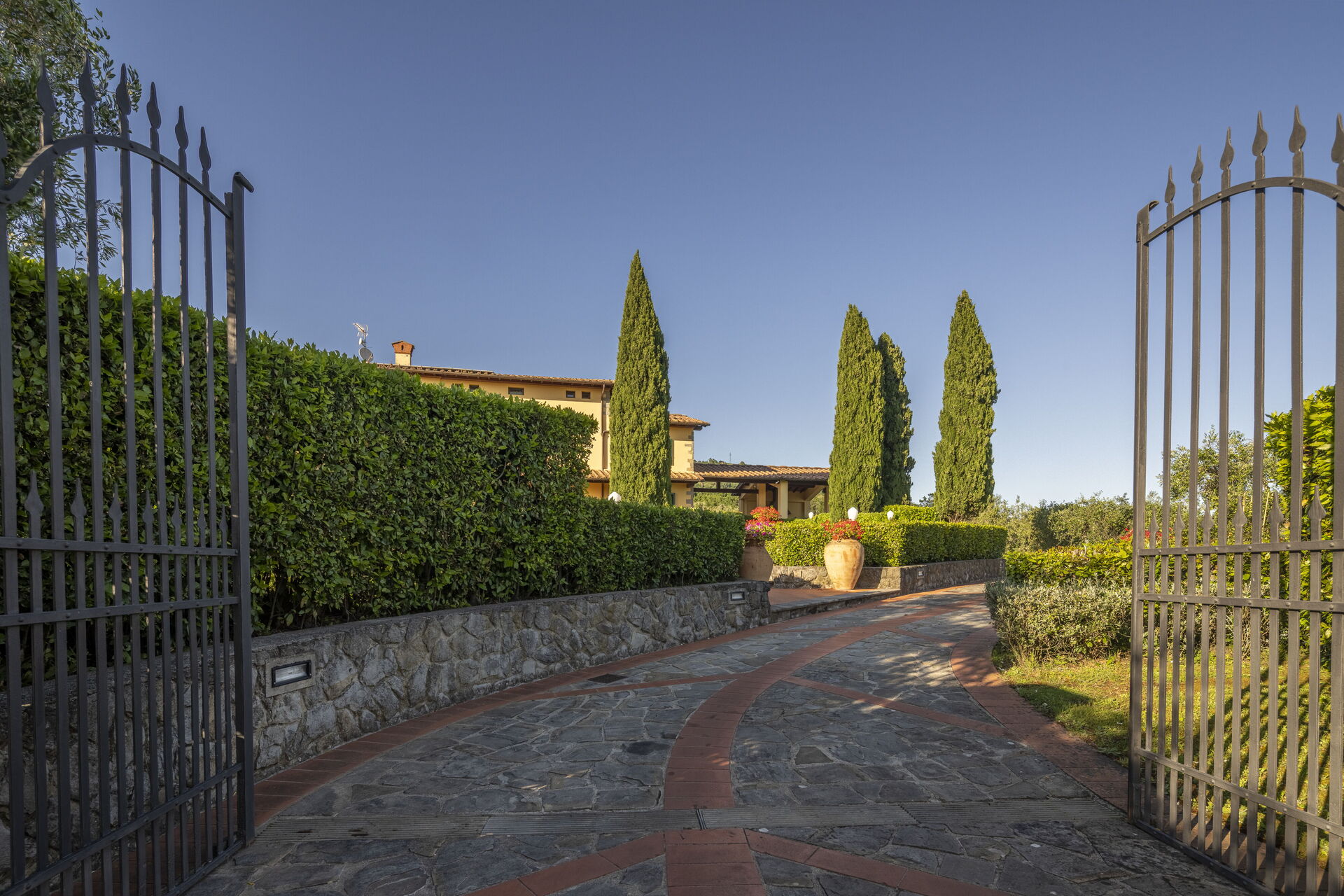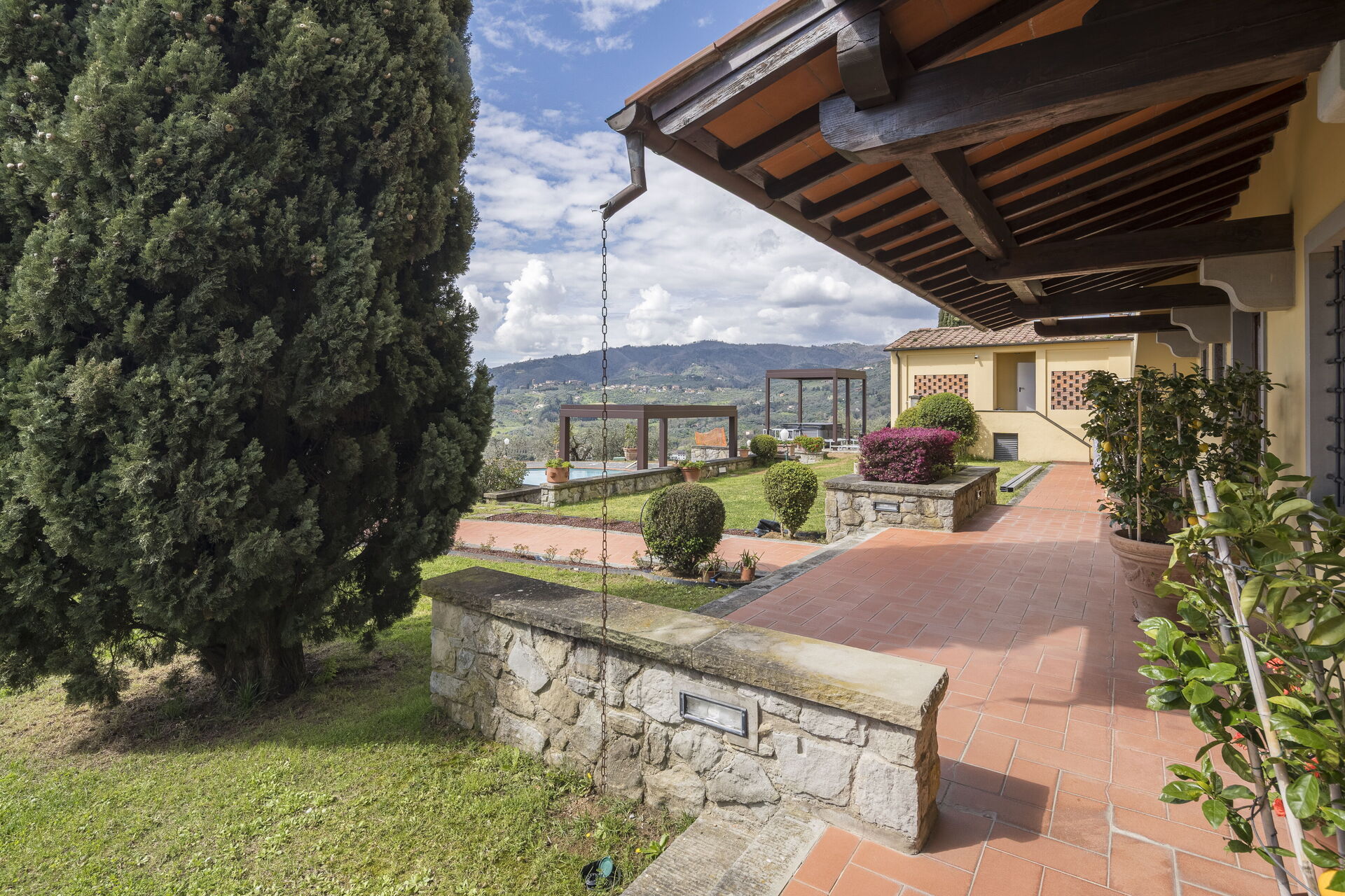 Gli spazi esterni sono immersi nel verde, con giardini curatissimi per godere del panorama dei paesaggi rurali della Valdinievole. Il bellissimo parco recintato che circonda la casa è ricco di siepi che segnano il confine per salvaguardare la vostra privacy e i caratteristici ulivi, simbolo per eccellenza della Toscana. Il prato ben curato è rifinito all'inglese e offre zone d'ombra naturali e una rigogliosa vegetazione profumata come rose, oleandri e piante aromatiche. La zona pranzo all'aperto è attrezzata con un barbecue in muratura e un forno a legna.