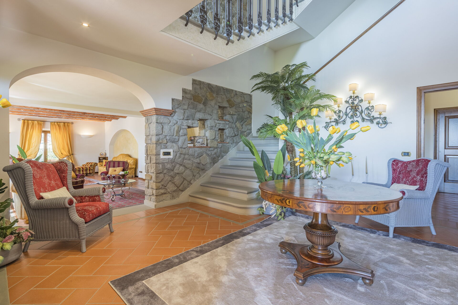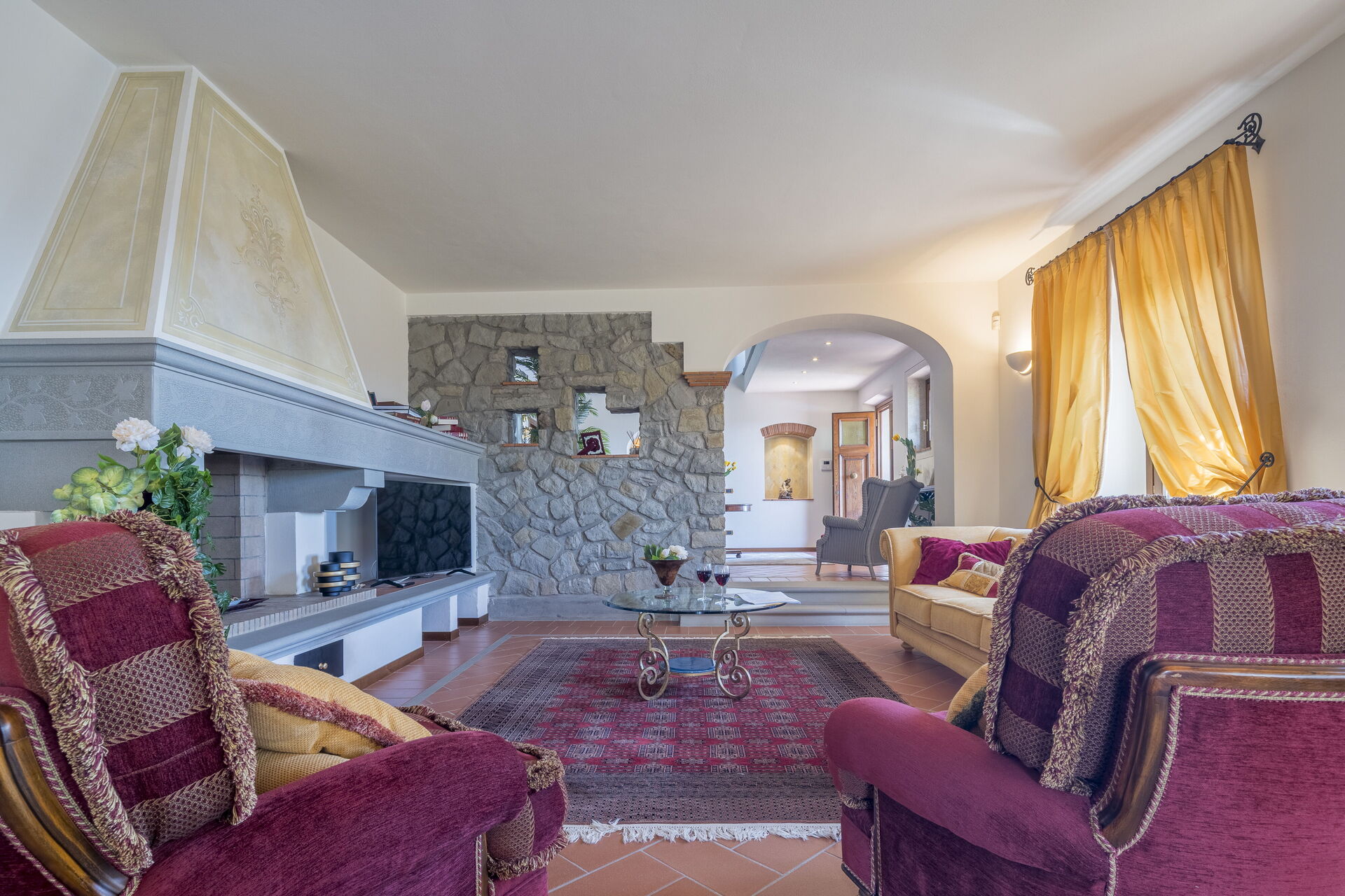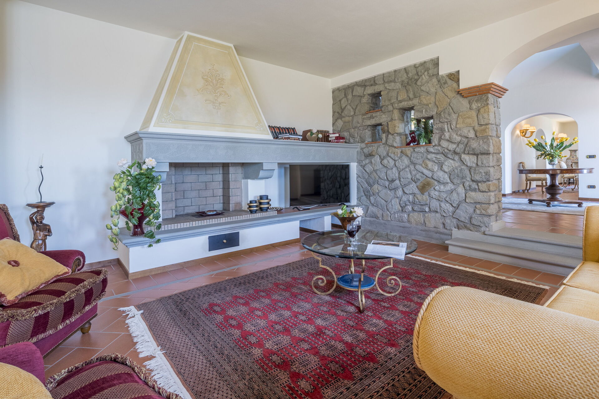 La villa è disposta su tre piani. Il portone di ingresso principale si trova al piano terra. Questo piano è suddiviso in zona giorno composta da salone con TV Satellitare e camino ( ornamentale), sala da pranzo ,cucina attrezzata con accesso al giardino, Palestra, toilette. Tramite una scala in pietra serena si accede al primo piano composto da tre camere matrimoniali con bagno en suite di cui uno con vasca idromassaggio e cabina armadio e in due Matrimoniali troviamo un divano letto singolo (2 posti) e una poltrona letto singolo ( 1 posto) Al 2 ed ultimo piano troviamo ampio soggiorno con camino ornamentale, 2 camere matrimoniali, bagno con doccia.