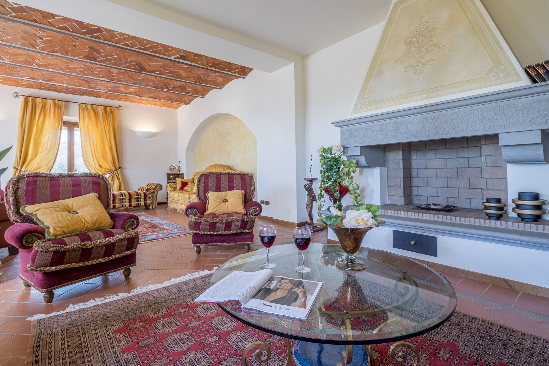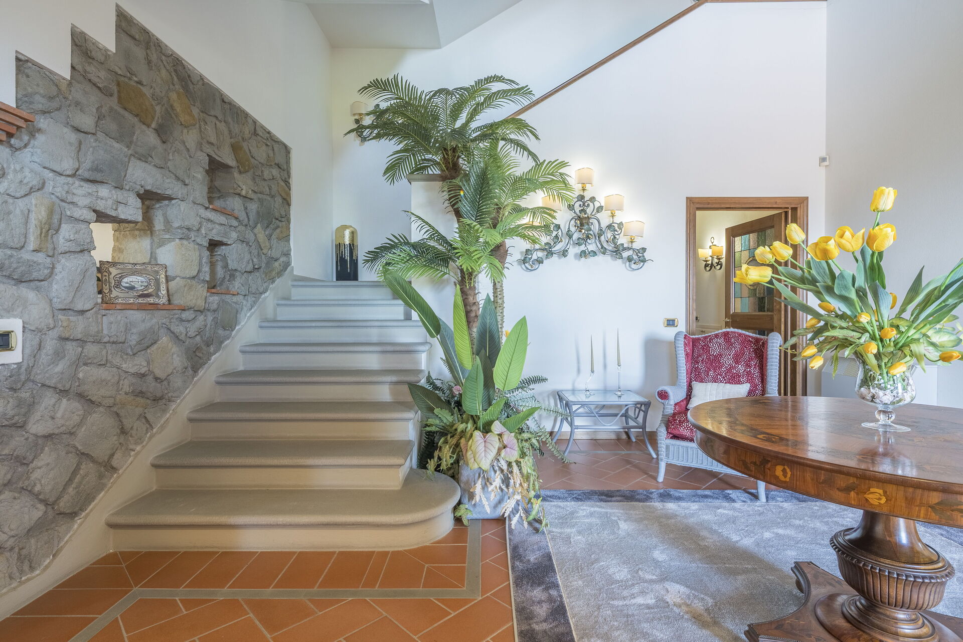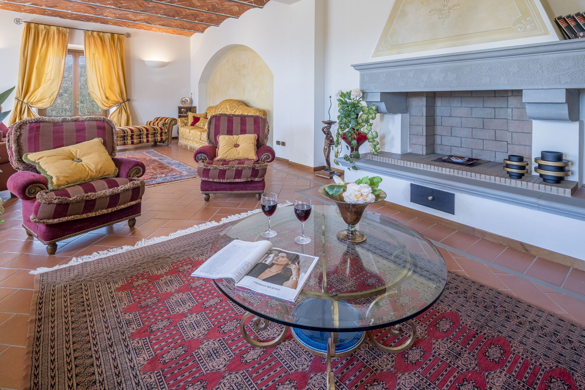 La villa è disposta su tre piani. Il portone di ingresso principale si trova al piano terra. Questo piano è suddiviso in zona giorno composta da salone con TV Satellitare e camino ( ornamentale), sala da pranzo ,cucina attrezzata con accesso al giardino, Palestra, toilette. Tramite una scala in pietra serena si accede al primo piano composto da tre camere matrimoniali con bagno en suite di cui uno con vasca idromassaggio e cabina armadio e in due Matrimoniali troviamo un divano letto singolo (2 posti) e una poltrona letto singolo ( 1 posto) Al 2 ed ultimo piano troviamo ampio soggiorno con camino ornamentale, 2 camere matrimoniali, bagno con doccia.