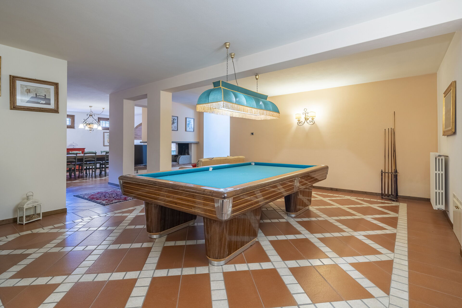 Al piano inferiore, ambiente open space con zona TV e camino, tavolo da biliardo, poltrona letto singolo ( 1 posto) , cucina attrezzata in muratura , sala da pranzo, bagno con doccia. Il piano inferiore si completa di lavanderia e garage con accesso diretto internamente.