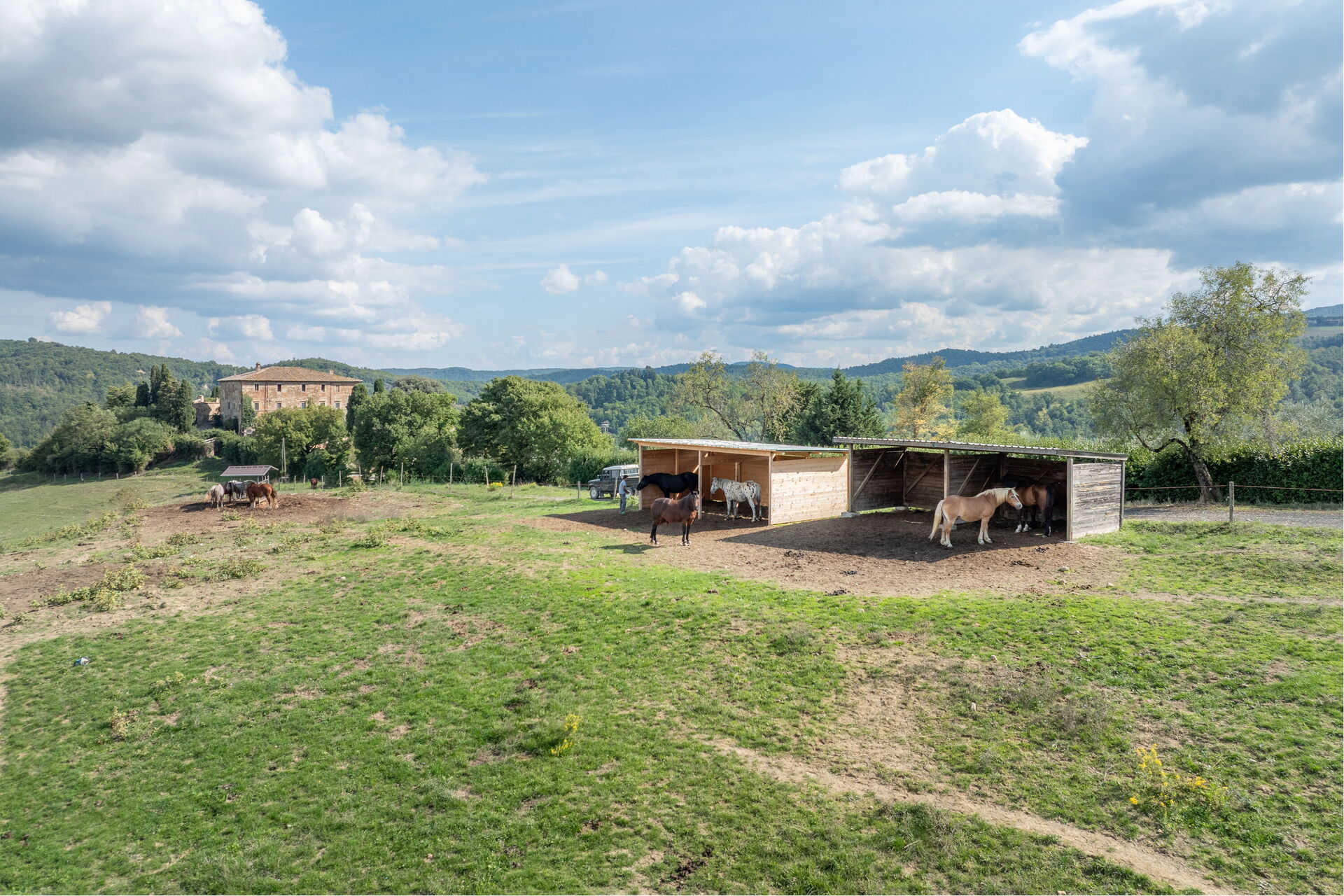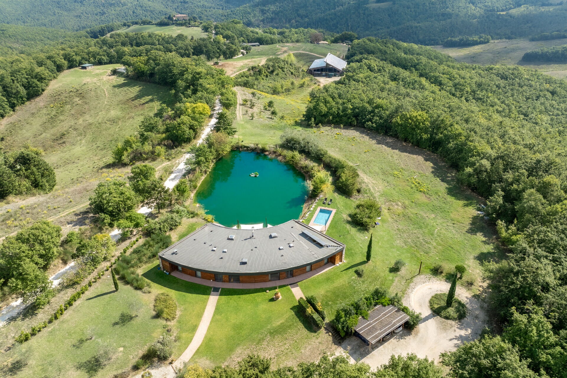 Il giardino che incornicia la villa si estende per circa 4000 mq, è molto ben curato, per la sua gran parte a prato, ospita alte piante di ginestra che fanno da padrone circondando il laghetto naturale di fronte alla zona pranzo esterna e alla piscina. Il laghetto, la cui profondità al centro raggiunge i 2,5 m, non é balneabile. L'atmosfera è silenziosa, rilassante e riservata. La zona pranzo esterna è riparata da ampie vele che coprono tutta l’area dove sono presenti il tavolo, le sedie ed un barbecue professionale, perfetta per pranzi e cene all'aperto. Personalizza la villa 10 ettari di terreno per la gran parte disponibili per le lunghe cavalcate nella bellissima cornice toscana, un luogo destinato al ristoro del corpo e dello spirito.