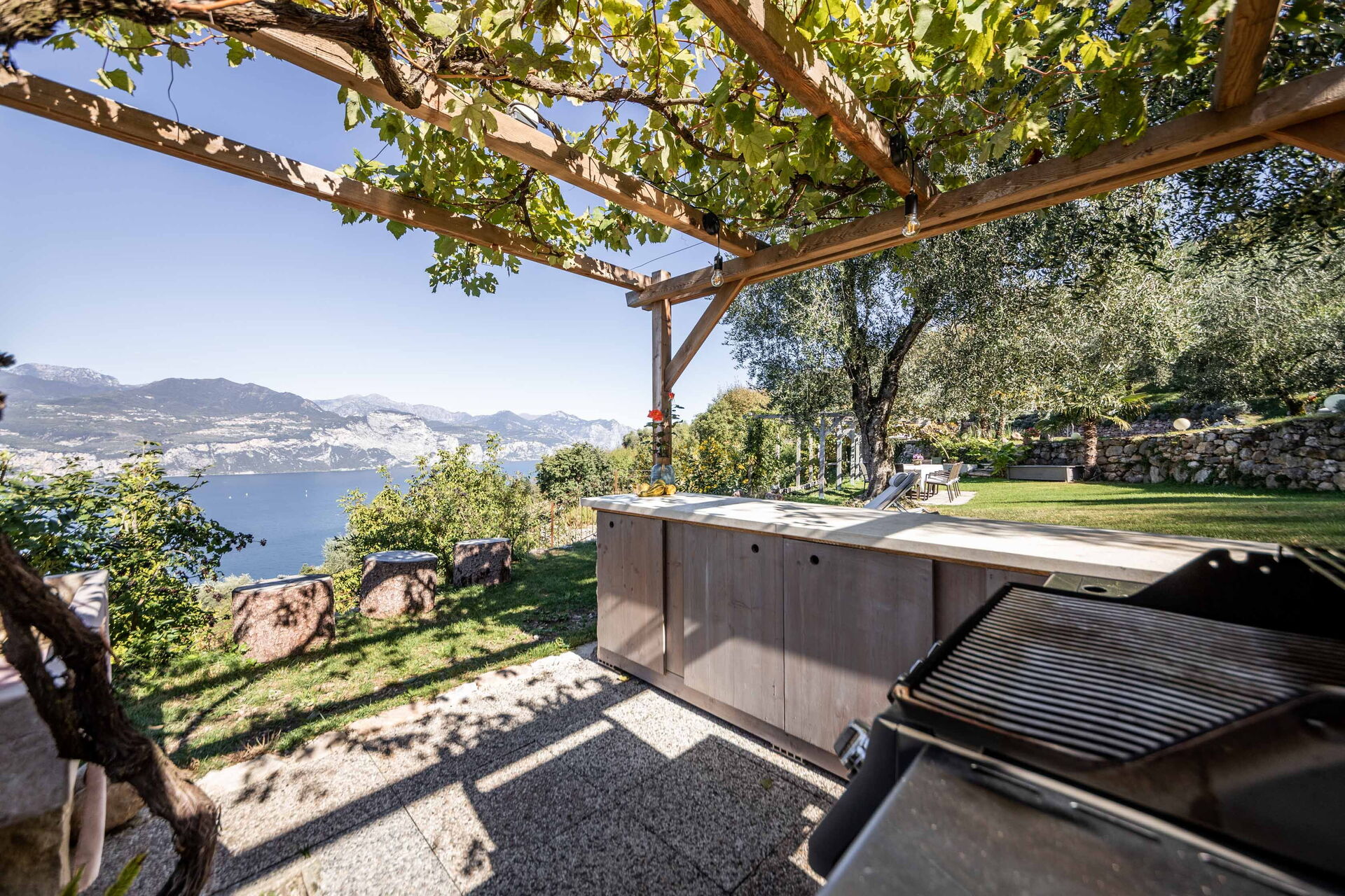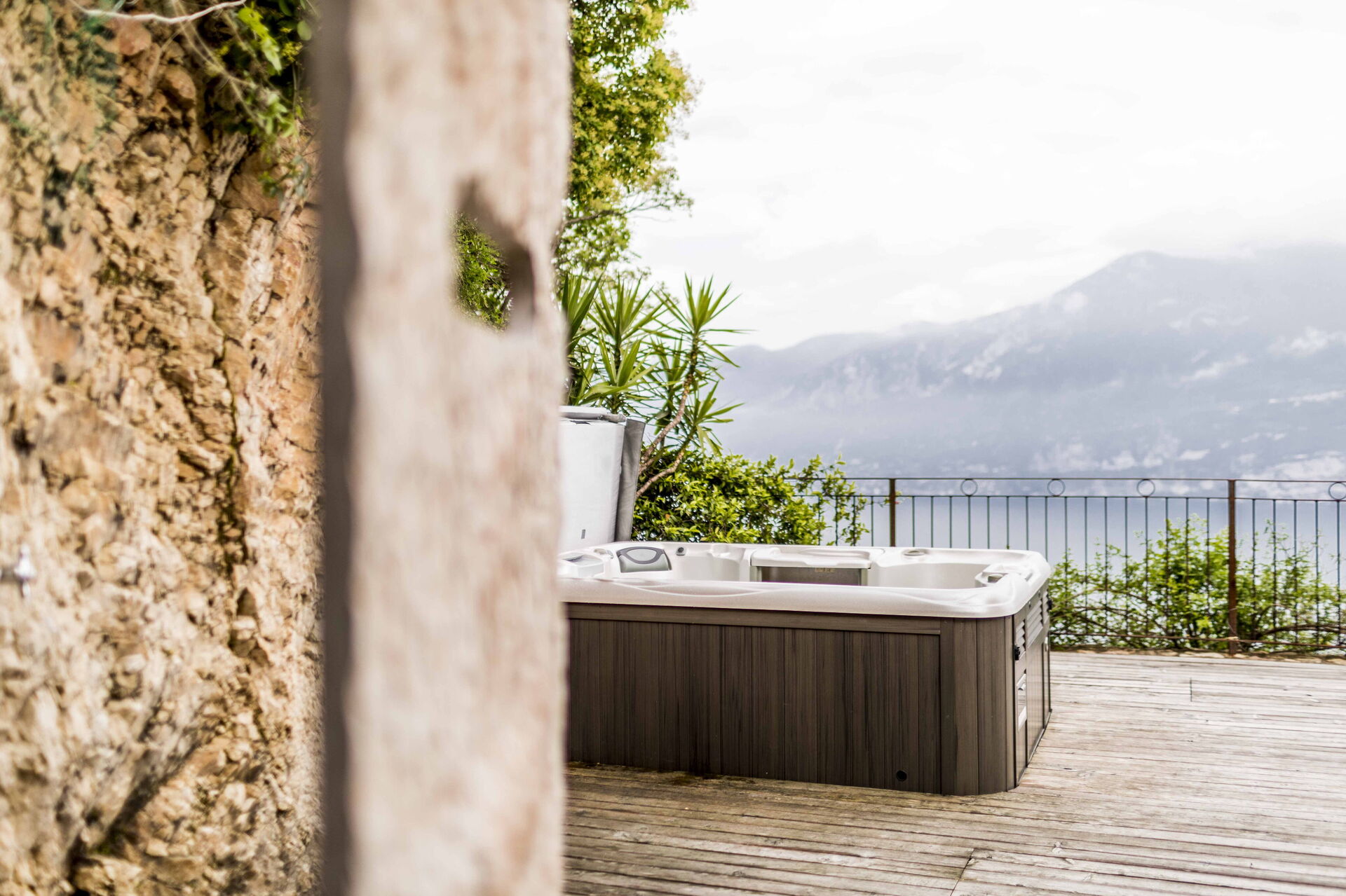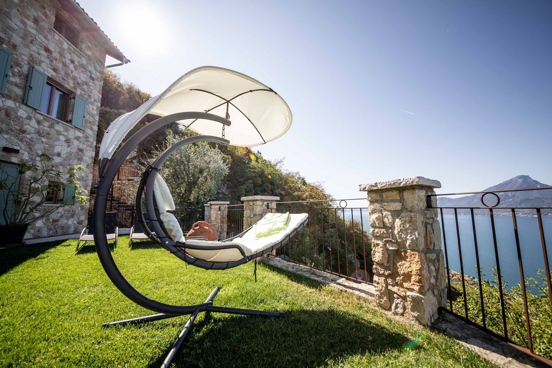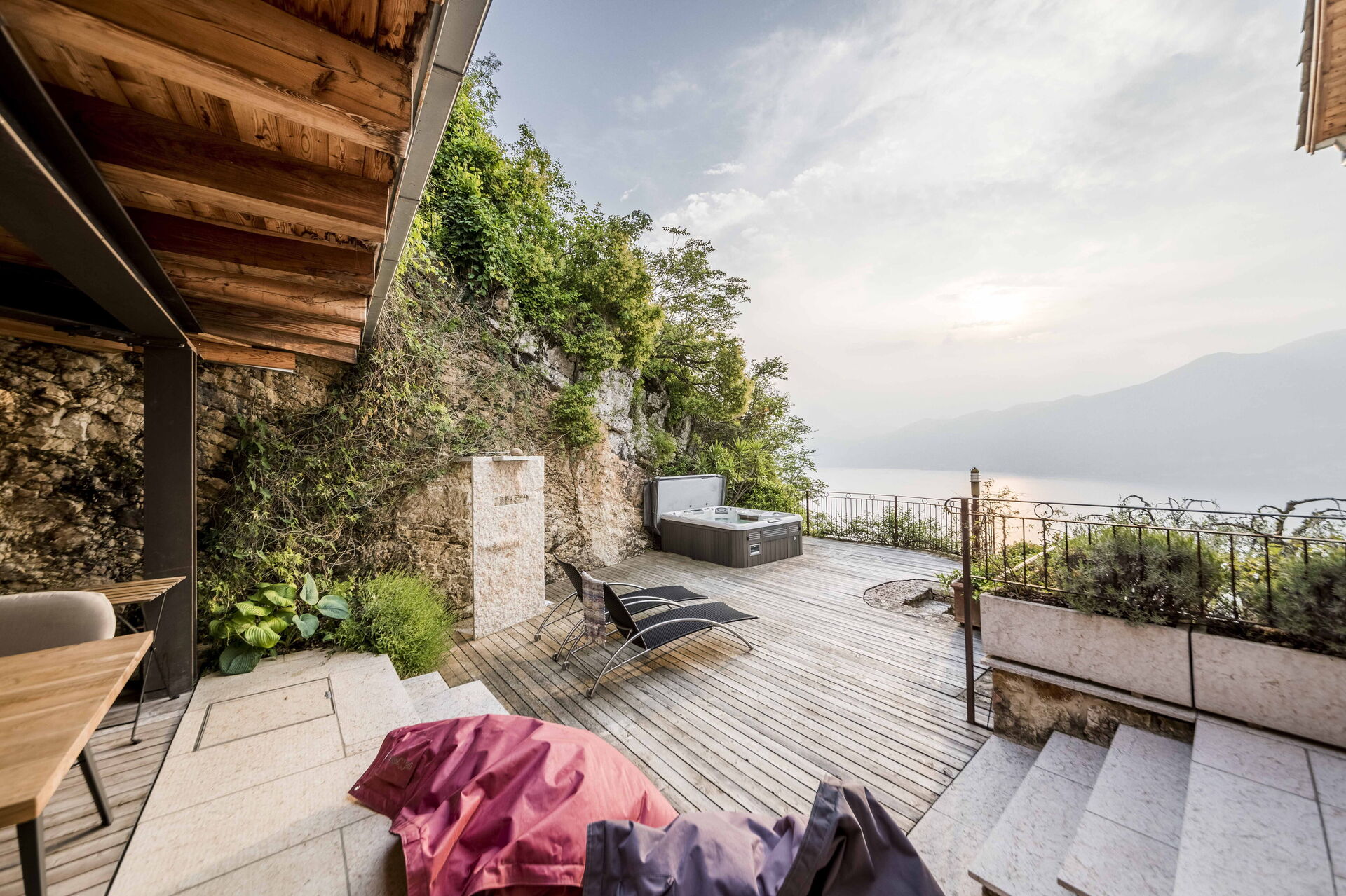 L’ampia zona solarium del giardino – con sdraio, ombrelloni e dondoli -, è servita da un piccolo laghetto balneabile, dove potrete nuotare tra ninfee e piante acquatiche o starvene all’ombra di un banano o di altri alberi tropicali, e da una meravigliosa terrazza con vasca idromassaggio riscaldata, per immergervi e godervi un po’ di relax anche nelle giornate e nelle serate più fresche. In un’altra terrazza, invece, un grande tavolo in legno con sedie vi permetterà di pranzare e cenare in uno scenario unico proprio sopra le acque del lago di Garda facendovi godere dell’emozione di stare realmente sospesi tra cielo e terra. Un angolo di Paradiso dove troverete anche un’area barbecue da vivere soprattutto al calar della sera per un aperitivo o per una grigliata in comitiva.